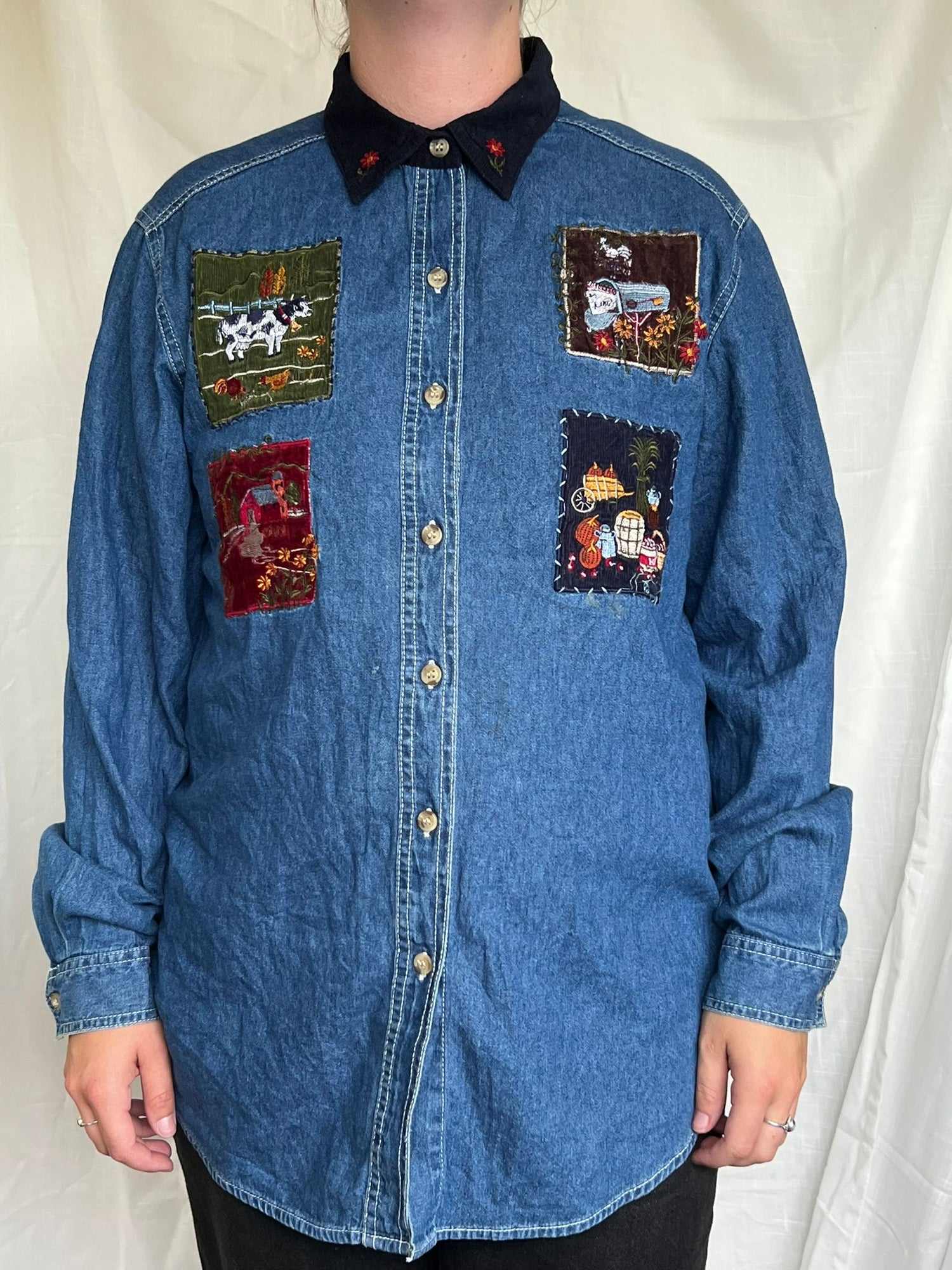A cozy denim blouse with patchwork and embroidered details that tell a little countryside story; from a sweet autumn cow to flowers and farm-inspired touches. It feels like a crisp walk through golden fields at dusk.