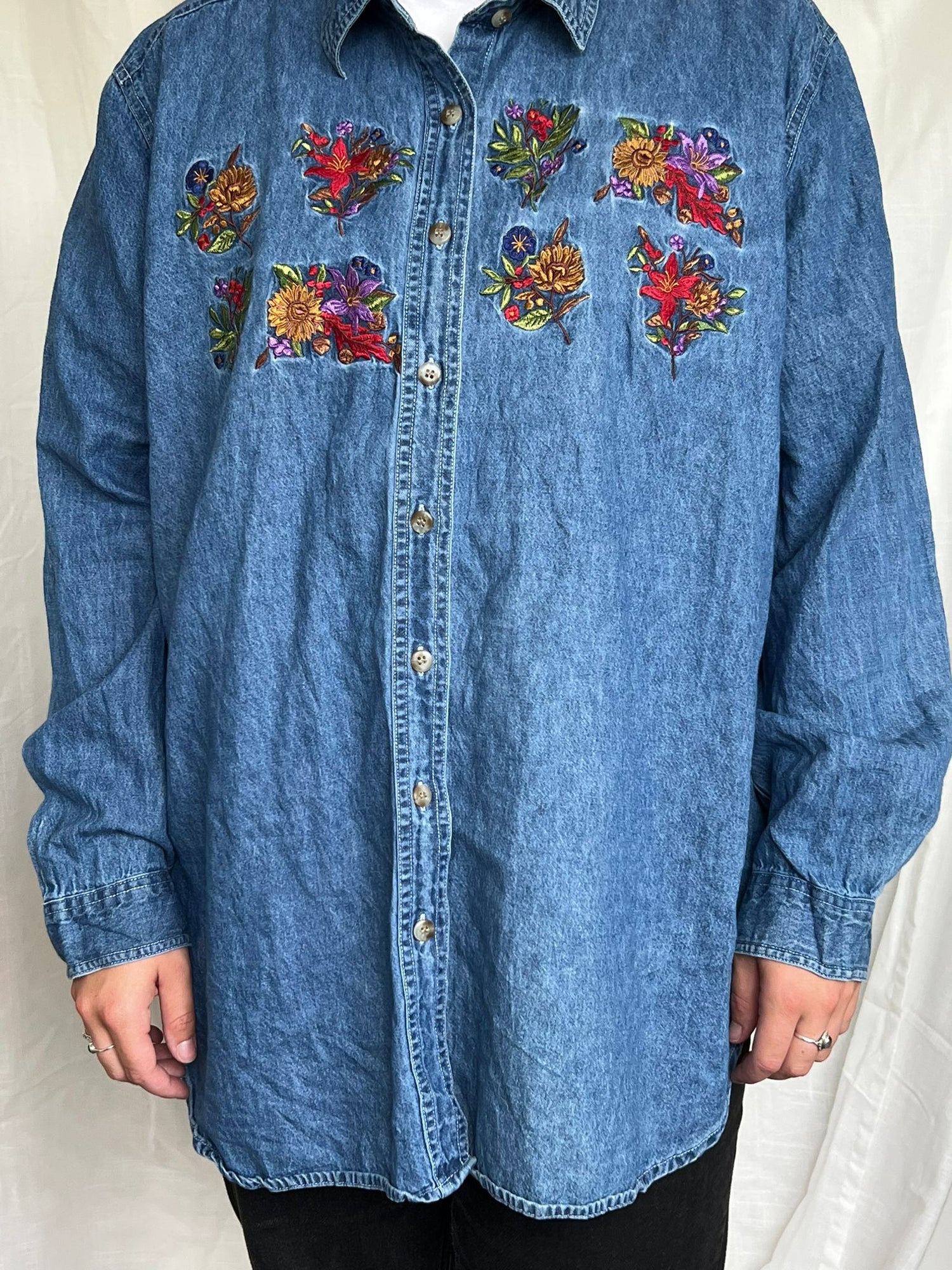 A soft denim blouse brought to life with embroidered sunflowers, leafy vines and pops of purple blooms; like a patchwork of a late-summer garden slowly turning into autumn. It’s equal parts rustic charm and timeless vintage.
