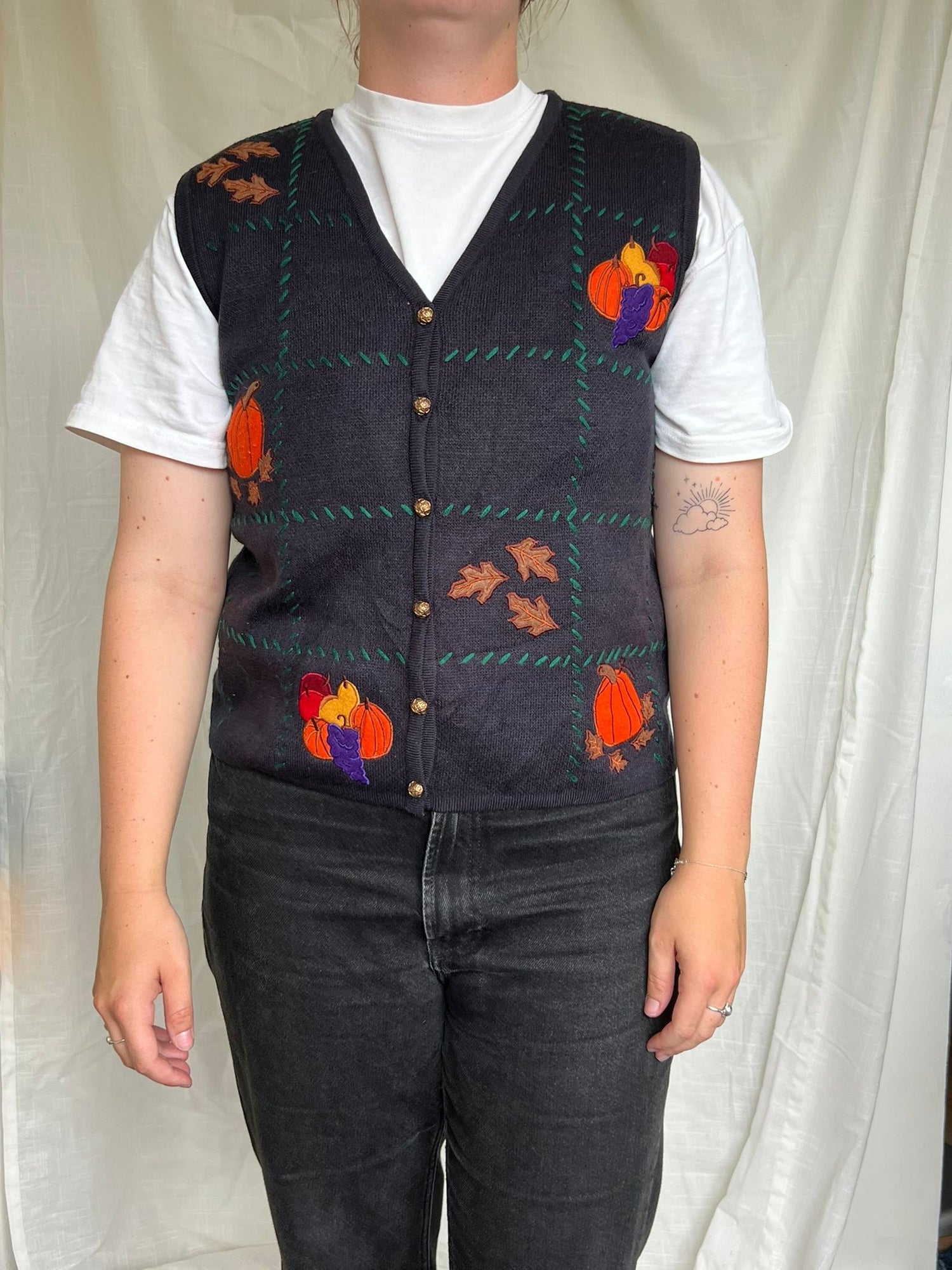 A cozy black knit adorned with patchwork pumpkins and autumn leaves, like the glow of a lantern on a chilly October night. This vest carries the warmth of harvest season wherever you go, perfect for layering over blouses or sweaters when the air turns crisp.