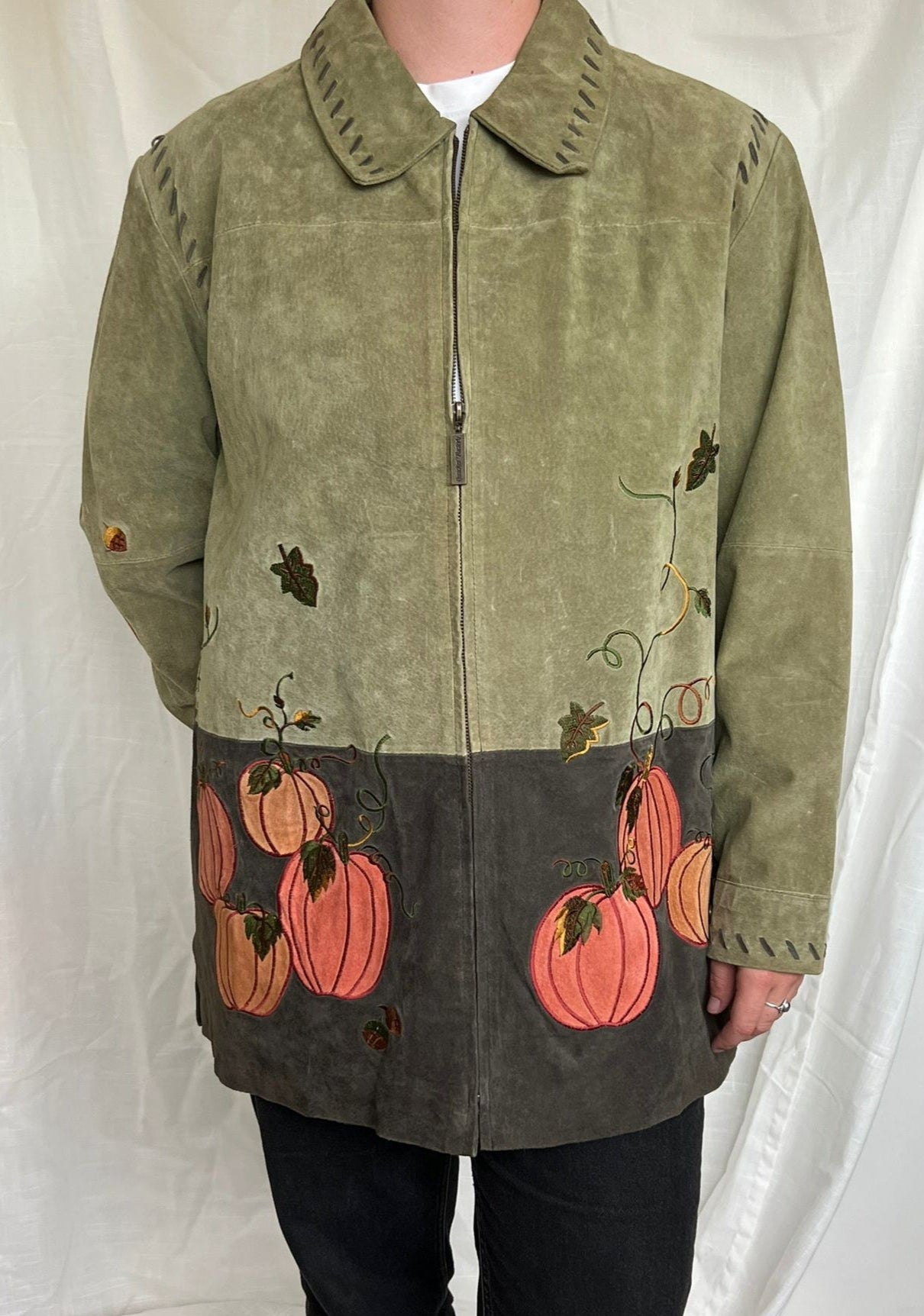 This vintage green leather jacket is unlike anything you’ll find, adorned with cozy pumpkin patchwork along the hem, it’s the ultimate autumn statement piece. The deep green pairs perfectly with the warm pumpkin tones, giving it that fresh-from-the-patch magic.