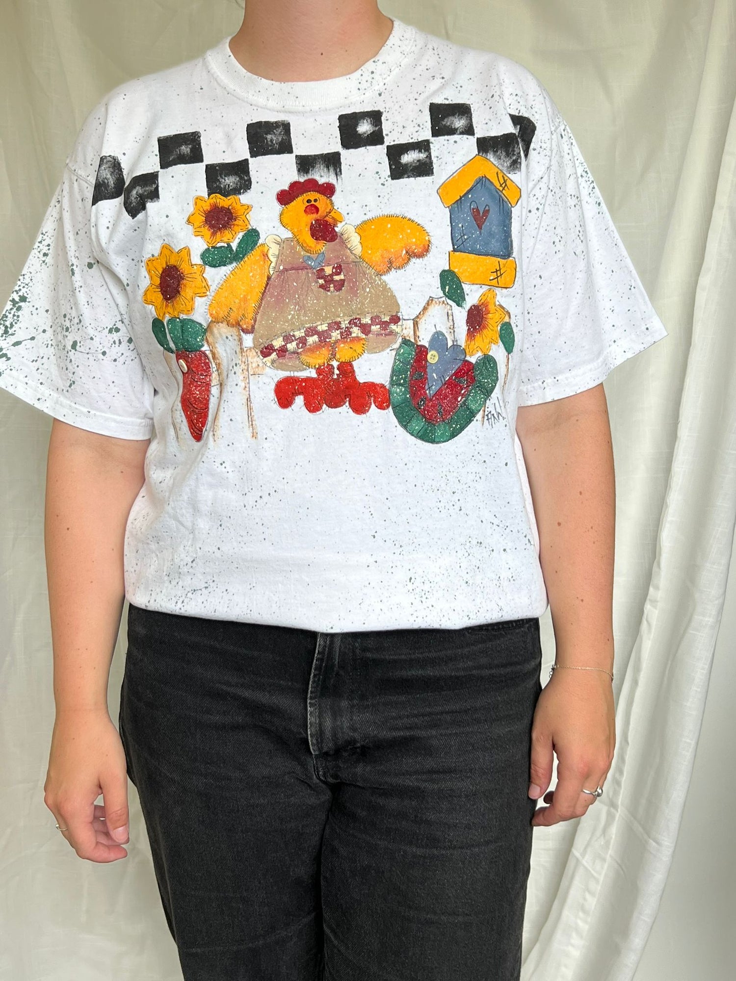 A speckled white tee brought to life with a colorful chicken, birdhouse and blooming sunflowers. It’s playful, a little quirky and carries that countryside charm that feels just right for crisp fall days.