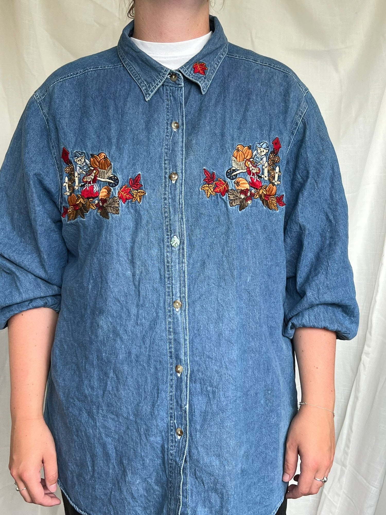 Little mice hard at work in the pumpkin patch; a scene straight from a storybook, stitched in warm autumn tones on soft denim. This blouse feels like a wearable harvest fairytale, equal parts whimsical and cozy.