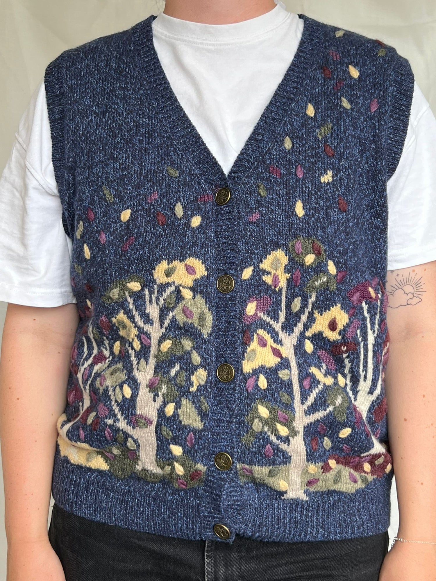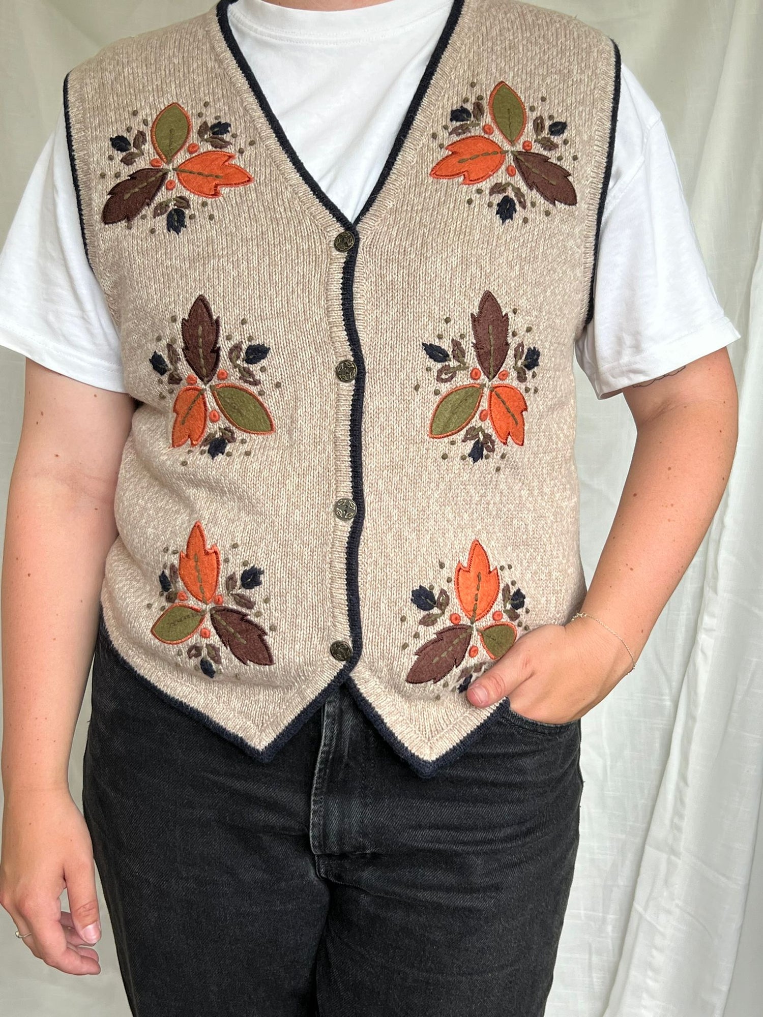 A cozy beige vintage knit vest, sprinkled with embroidered and patchwork leaves in warm tones of orange and brown, like carrying a piece of the forest floor with you. The perfect layering piece for crisp fall days.