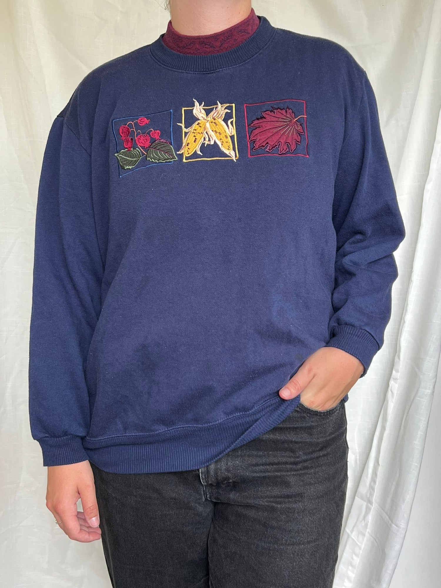 A deep purple crewneck sweater, beautifully contrasted with orange embroidered autumn leaves across the front. Like a stroll under a dusky October sky, with leaves glowing in the last golden light.