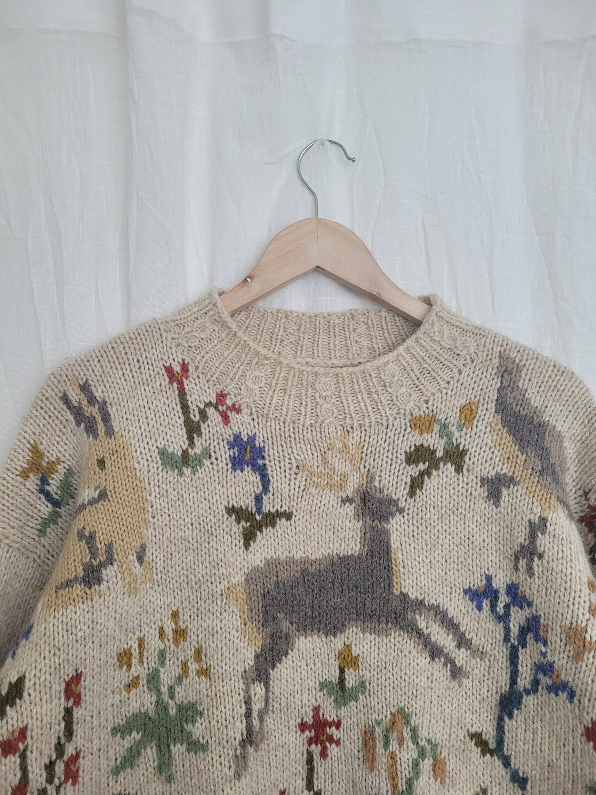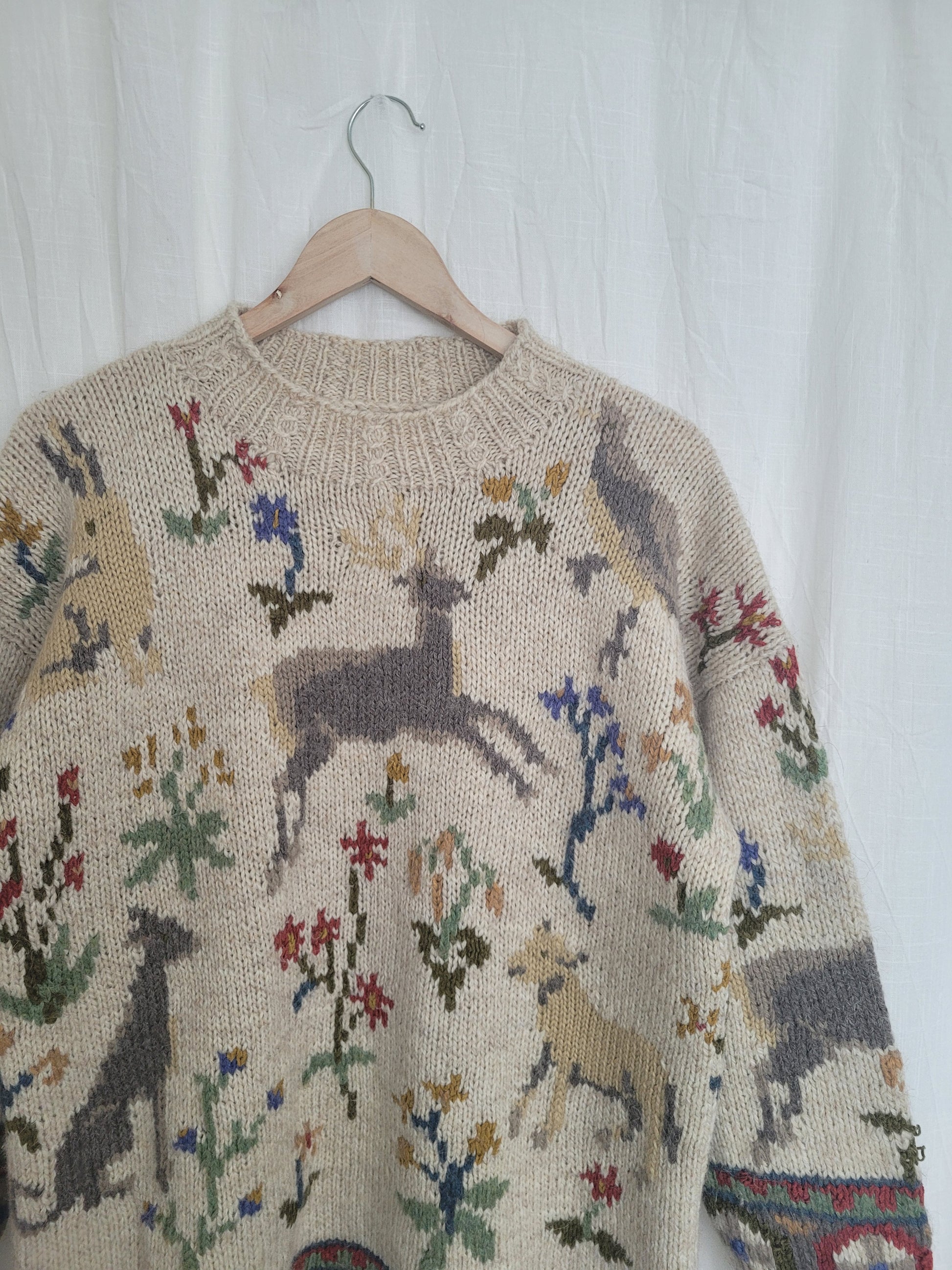 A beautiful beige knit sweater filled with storybook details, subtly woven into the fabric. Deer, goats, flowers and alpine plants appear like characters in a quiet mountain tale. It gives instant โ€œchalet window, snow outside, cocoa in handโ€ energy.