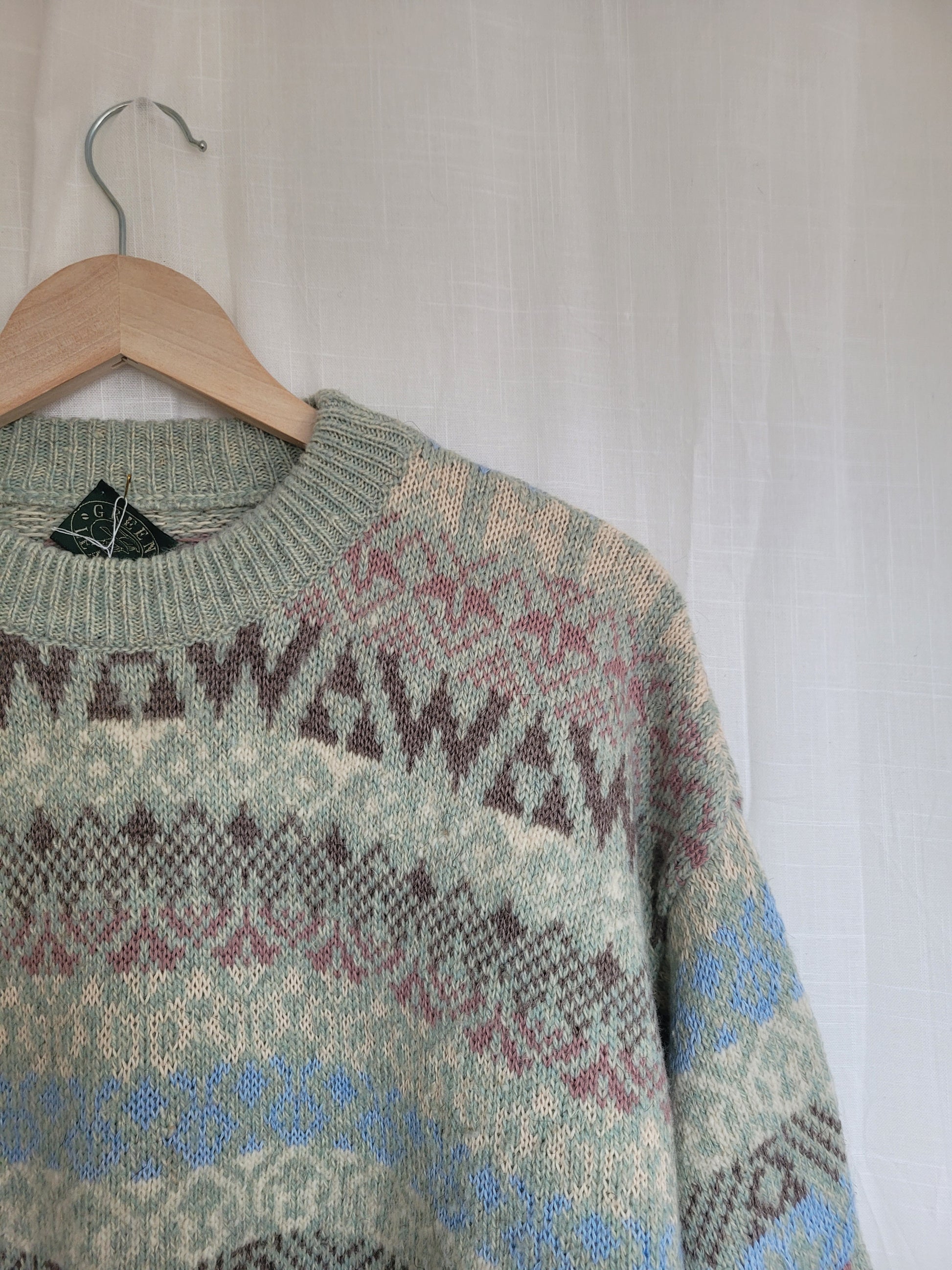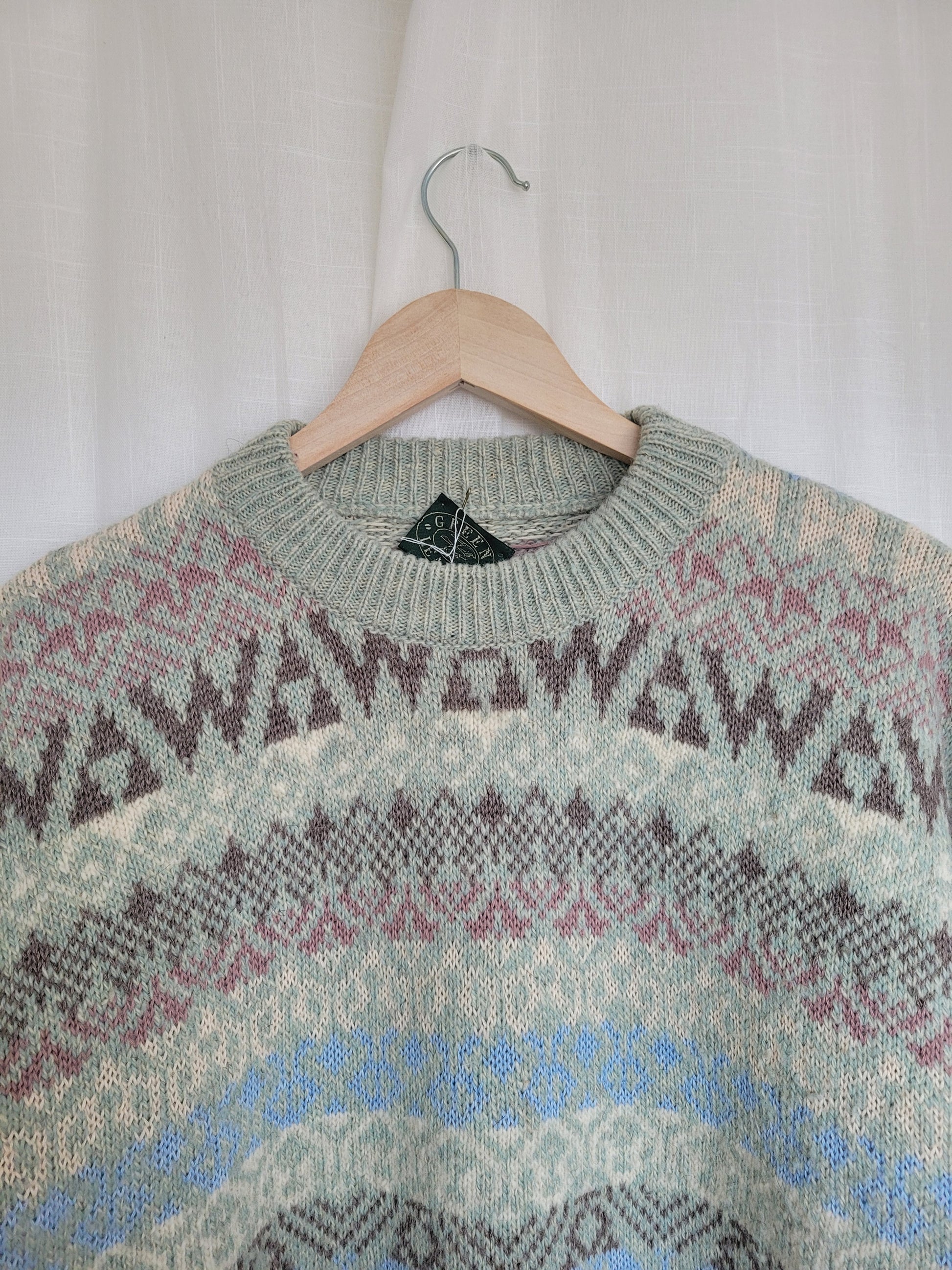 A cozy nod to grandpa’s favourite knits, this vintage sweater blends zigzags and gentle check patterns in peaceful shades of light blue, sage green, cream and warm brown.