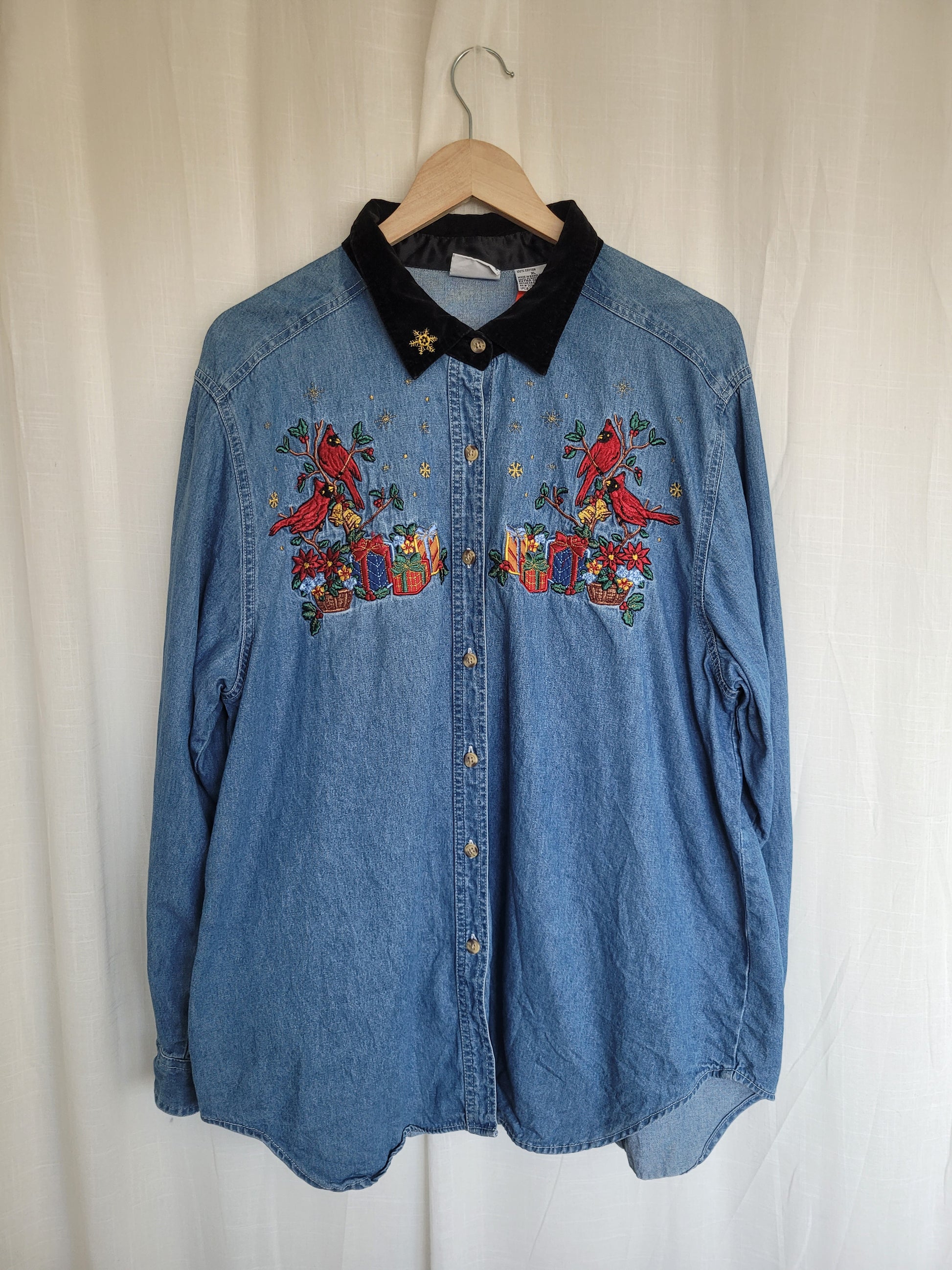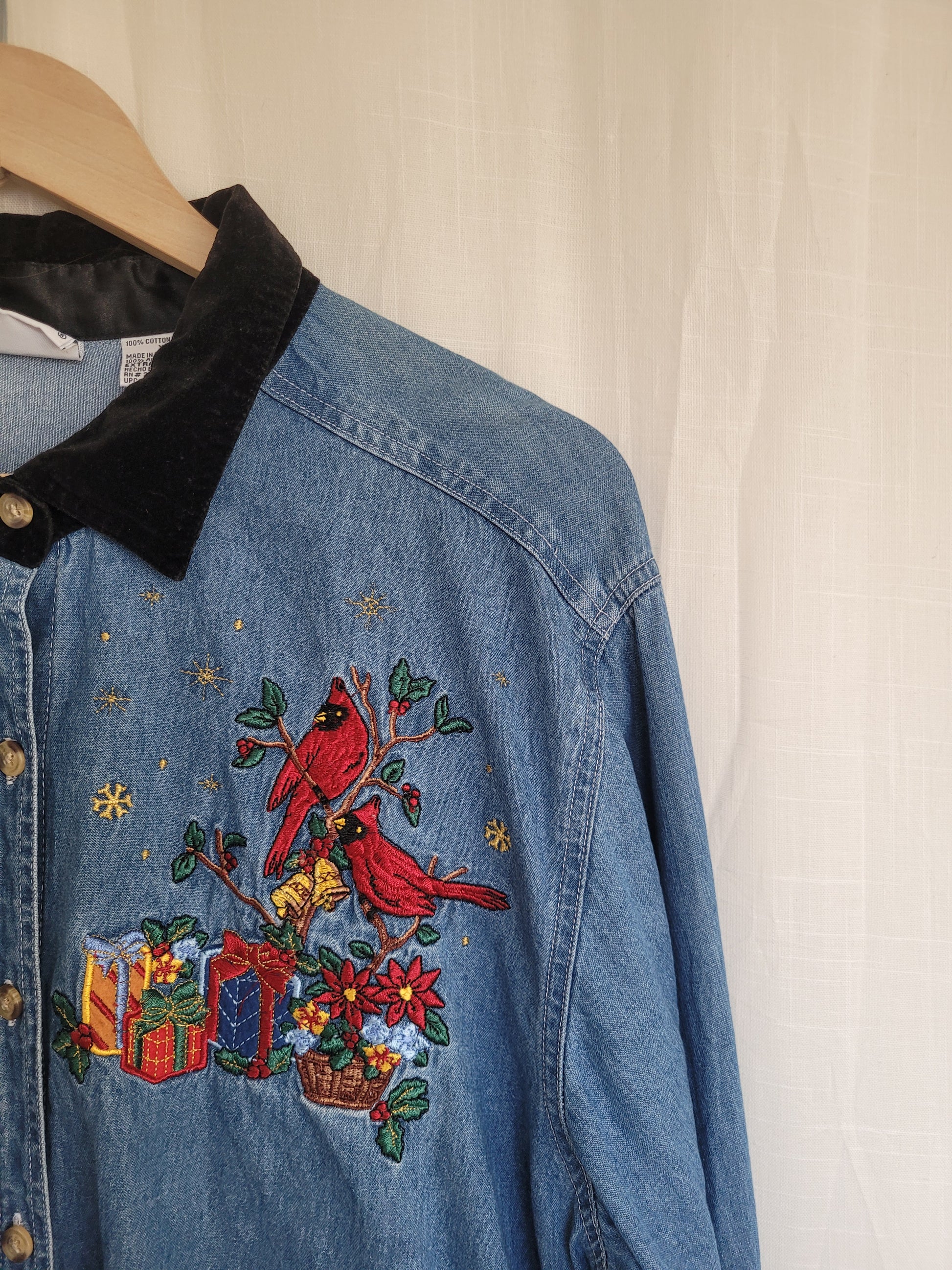 ποΈ Cardinals & Gifts - vintage denim blouse with embroidered Christmas details - size XL