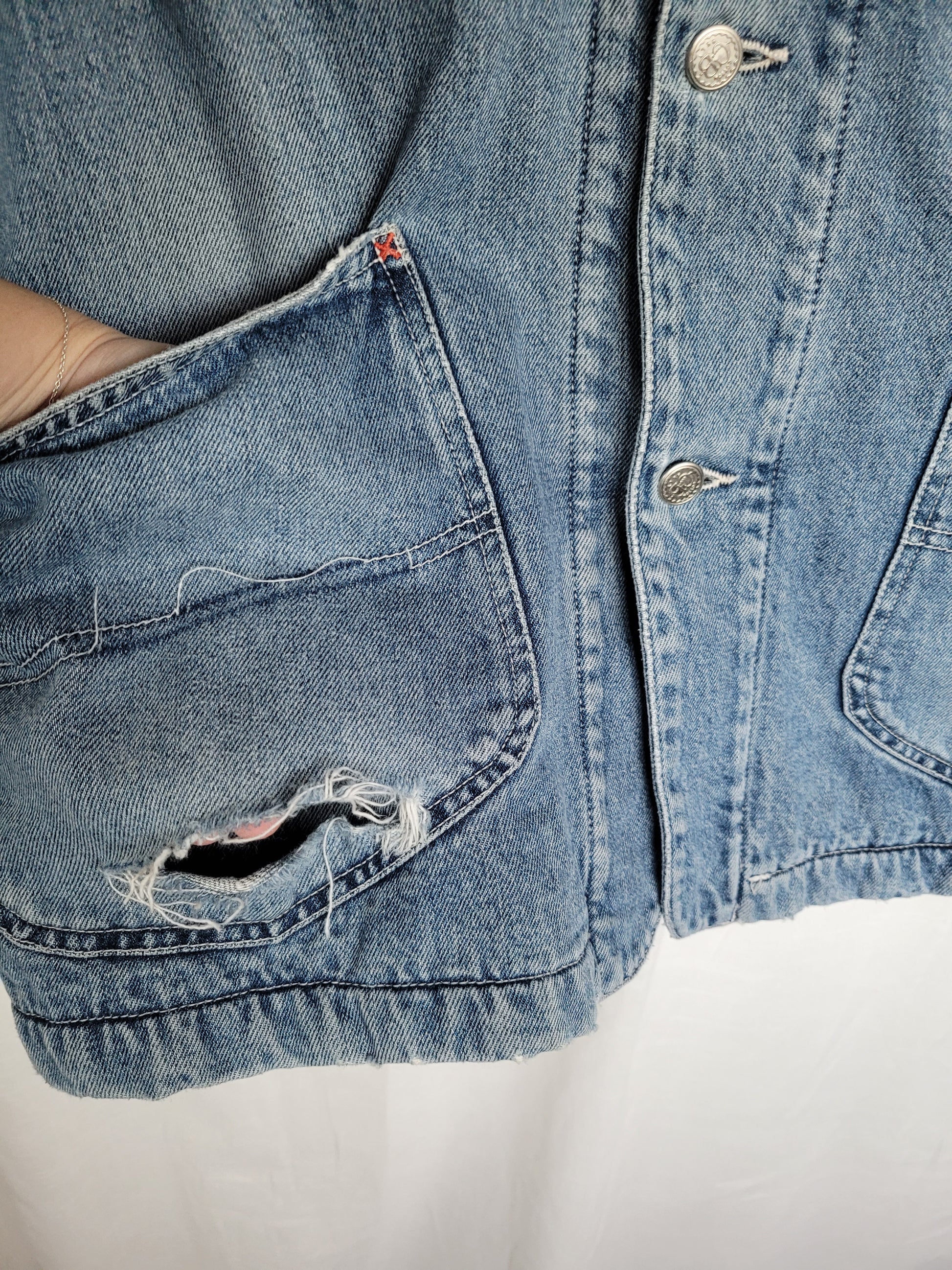 π Fields of Red & Blue - vintage denim jacket with red fleece lining - size M