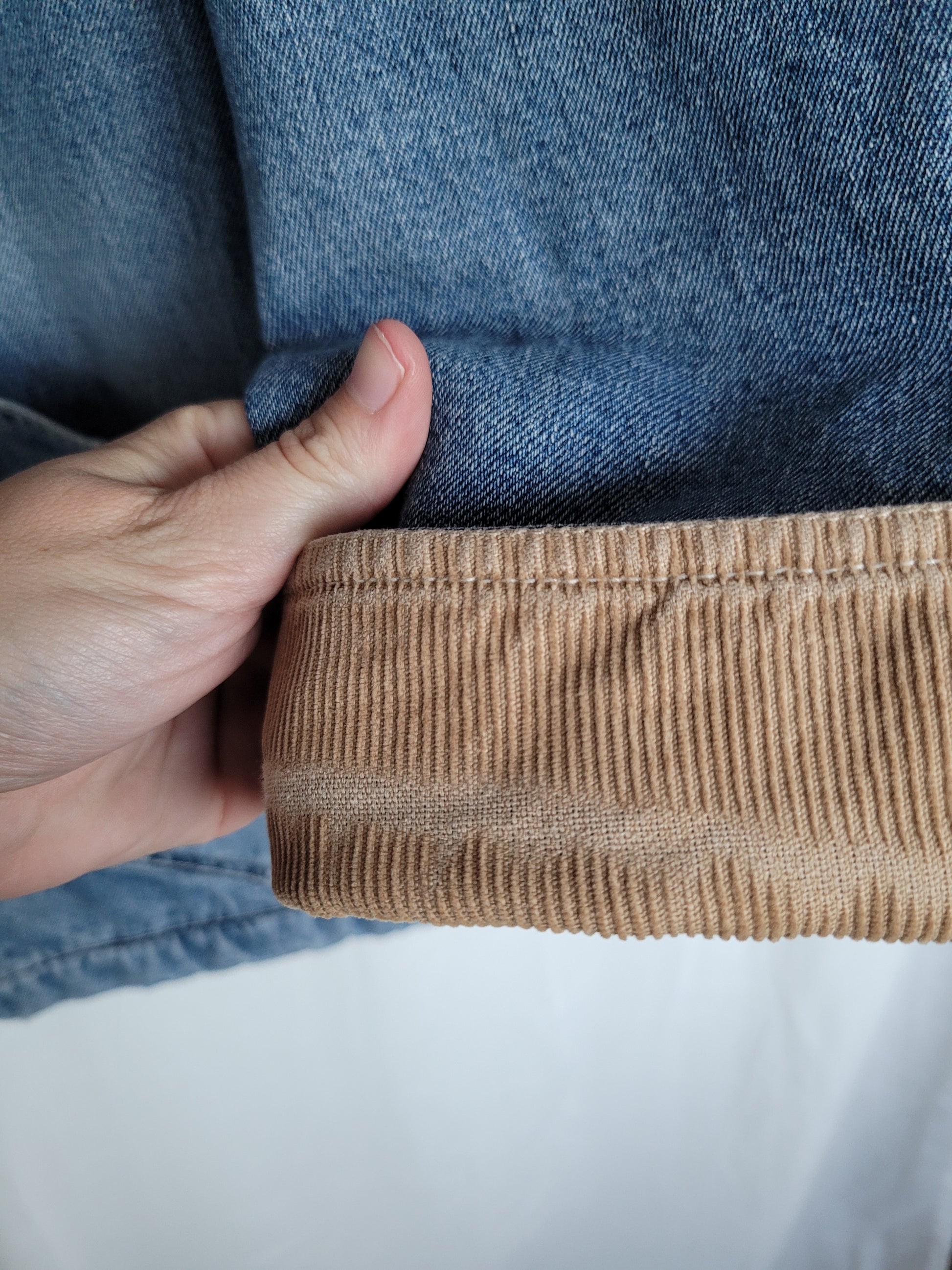 A vintage denim jacket kissed by autumn. Its soft red fleece lining and beige corduroy details bring warmth to chilly farm mornings, while the light blue denim carries that late-summer ease. One of the front pockets bears a tear; a mark of many stories lived, and more still to come.