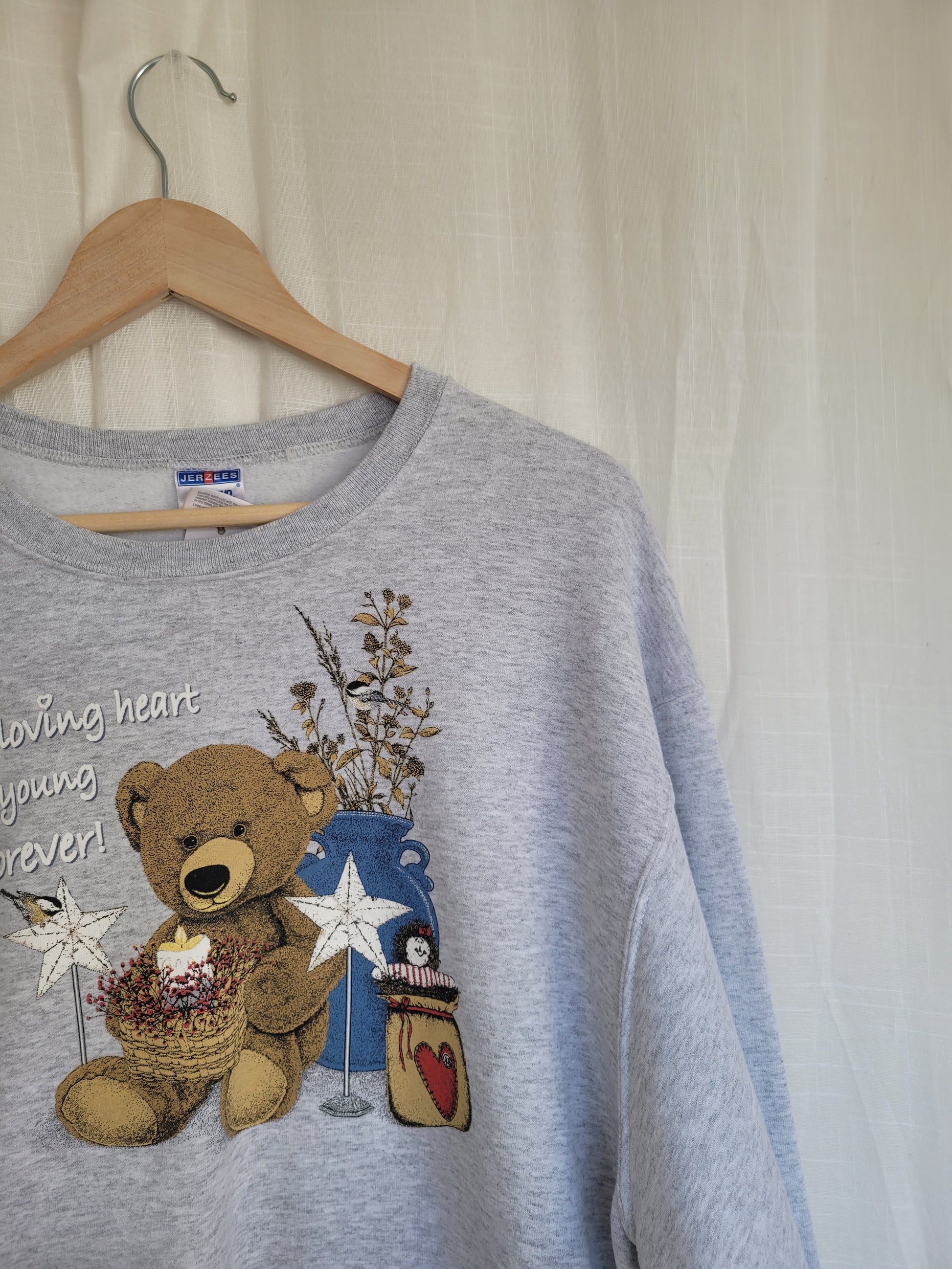 A soft light-grey crewneck featuring a sweet little bear leaning against a vase, surrounded by twinkling stars. Above it, the gentle message reads: “A loving heart stays young forever” — a tender reminder of joy, kindness and the warmth of the season.