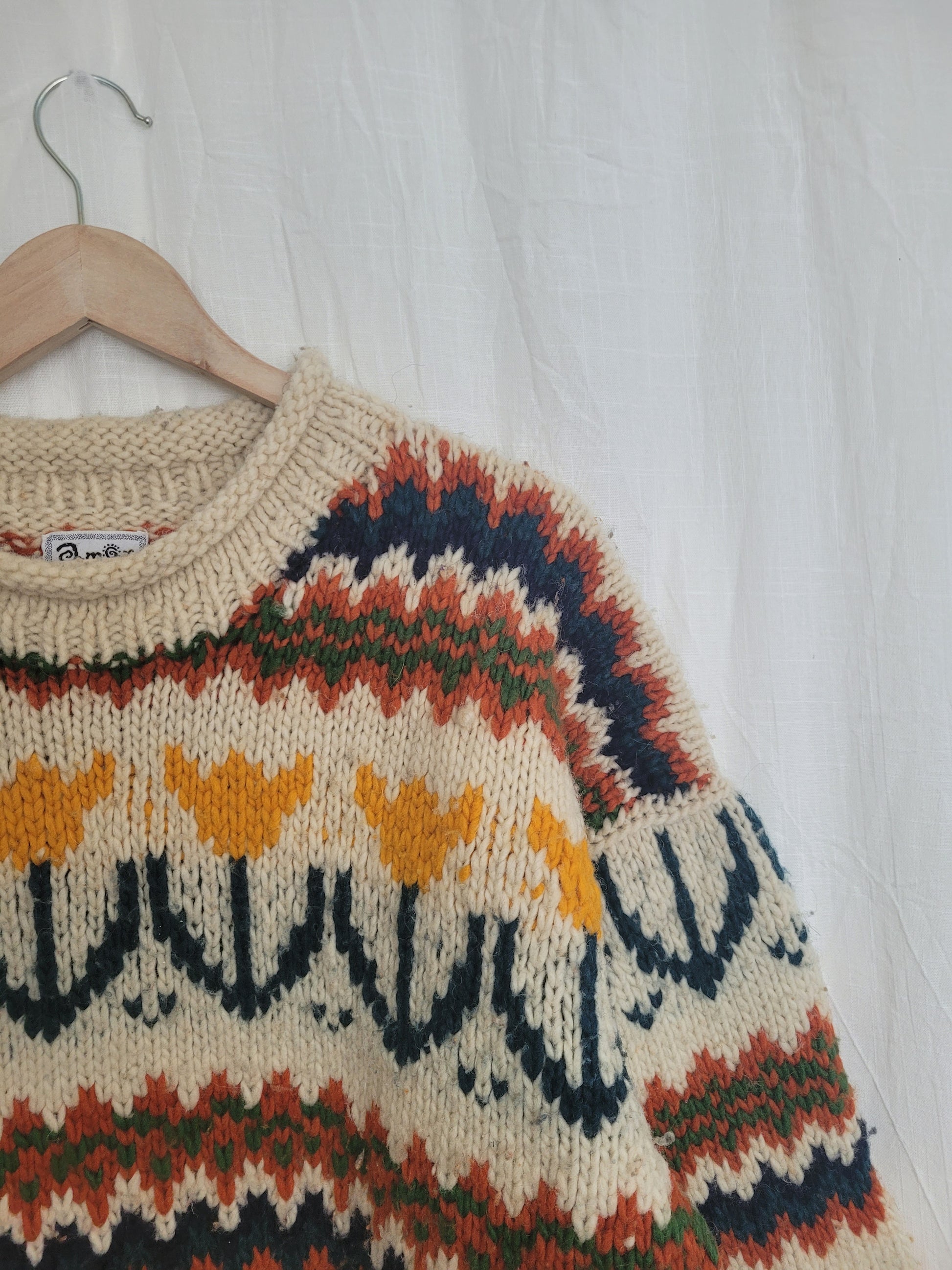A heavy, handknit sweater from Amor y Cafe with bold patterns in orange, yellow and petrol; tulips, zigzags and all the joy you can wear. The boxy fit makes it feel effortlessly cozy, a true statement knit with character (and a little pilling from all that love it’s already received).