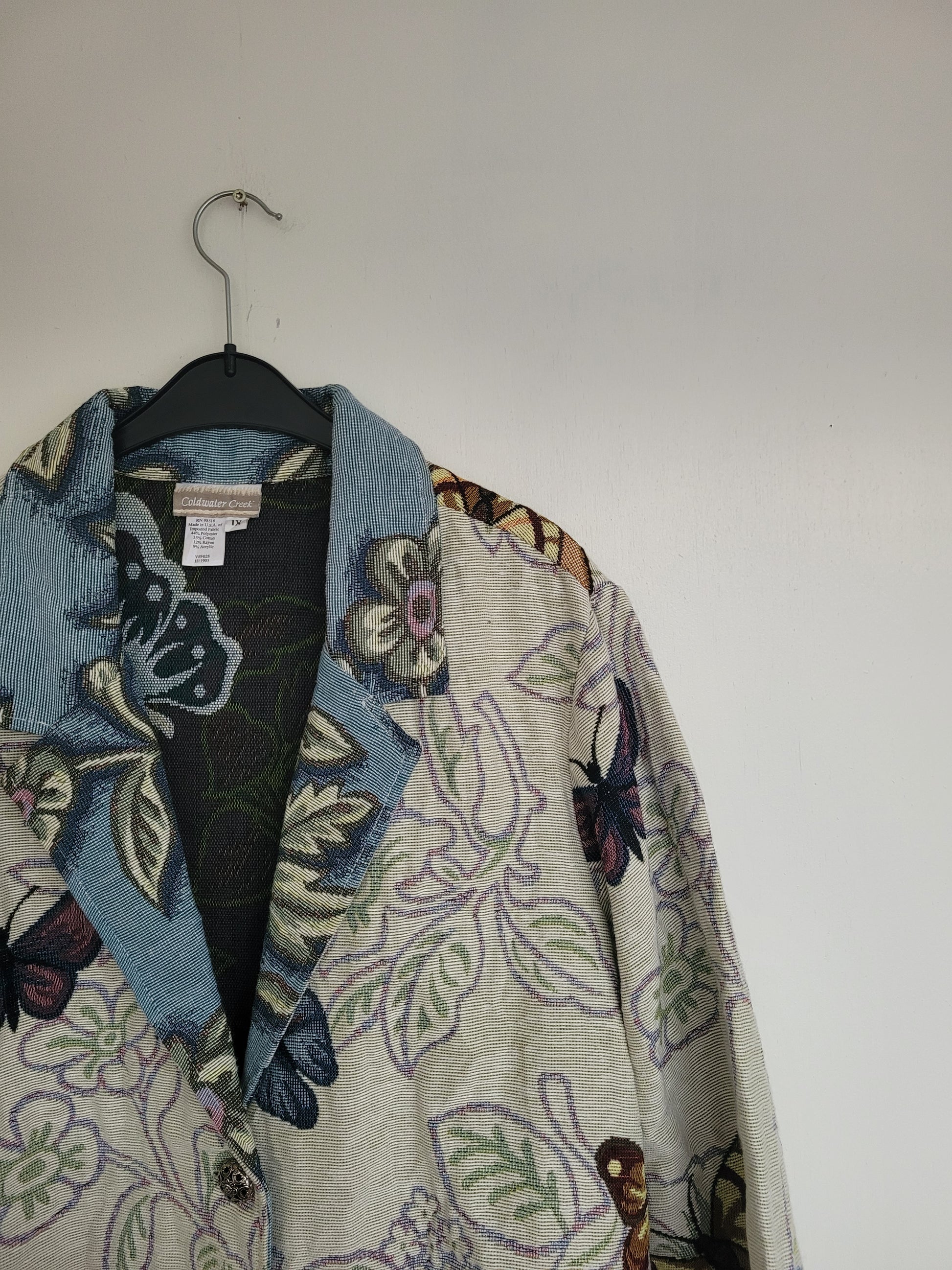 Een jas die aanvoelt als een gedicht in textiel. Deze geweven beauty in maat XL is rijk versierd met een vlinderpatroon en langs de mouwen en kraag vind je sierlijke bladeren en bloemen die het geheel een subtiele natuurmagie geven.